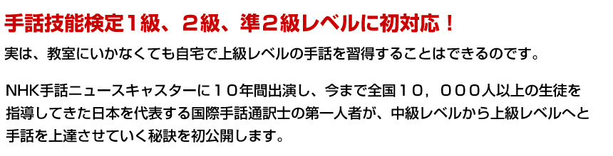 | A: | 今回は3級以上向け(1級、2級、準2級、3級)となっていますので全く手話をやったことが無い方はあてはまりません。前作の初級編手話講座からスタートして下さい。 |