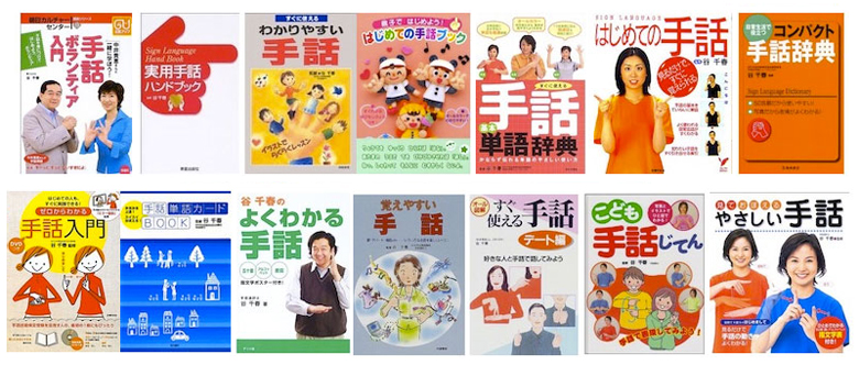 | ■旬報社 「手話ボランティア入門」 ■新星出版社 「実用手話ハンドブック」 ■梧桐書院 「すぐに使えるわかりやすい手話」 ■講談社 「親子ではじめよう!はじめての手話ブック」 ■日本文芸社 「すぐに使える手話基本単語辞典 」 ■主婦の友社 「はじめての手話―見るだけで、すぐに覚えられる」 ■主婦の友社 「ゼロからわかる手話入門―手の動きがすぐにマネできる」 ■梧桐書院 「手話単語カードBOOK―みるみる上達!スイスイおぼえる!」 ■ナツメ社 「谷千春のよくわかる手話」 ■梧桐書院 「覚えやすい手話」 ■大泉書店 「すぐ使える手話デート編」 ■ポプラ社 「こども手話じてんセット」 ■永岡書店 「見ておぼえるやさしい手話」 ■池田書店 「コンパクト手話辞典」 |